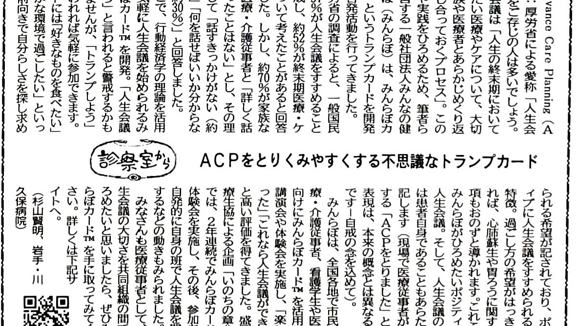 去る4月21日、全国紙『民医連新聞』の「診察室から」欄で、みんらぼカードを紹介し、読者の皆さまから反響をもらったことを報告しました。