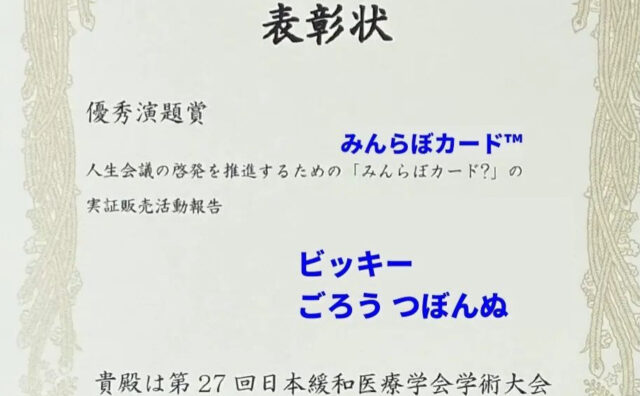 みんらぼカード みんらぼカード 日本緩和医療学会優秀演題賞受賞 を受賞 近所の朝市で「みんらぼカード」を出品しながら、人生会議の啓発活動をしたことを、日本緩和医療学会で報告したところ、優秀演題... 2022.08.31 みんらぼカード公衆衛生出版・研究