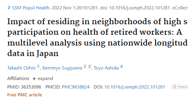出版・研究 研究報告 杉山共著 社会参加の盛んな地域の退職者は健康 杉山フェローの共著論文が刊行されました。結論としては、社会参加の多い地域で定年退職者は健康を維持できることが示されました... 2022.11.03 出版・研究