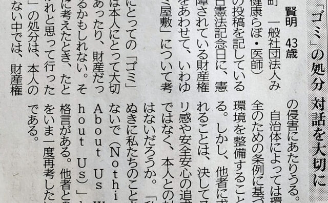 メディア 岩手日報に掲載 「ゴミの処分」対話を大切に 「ゴミ屋敷」──地域に少なからずそう言われて嫌われている箇所があるのではないでしょうか。ガラクタのように見える「ゴミ」の... 2023.05.10 メディア公衆衛生